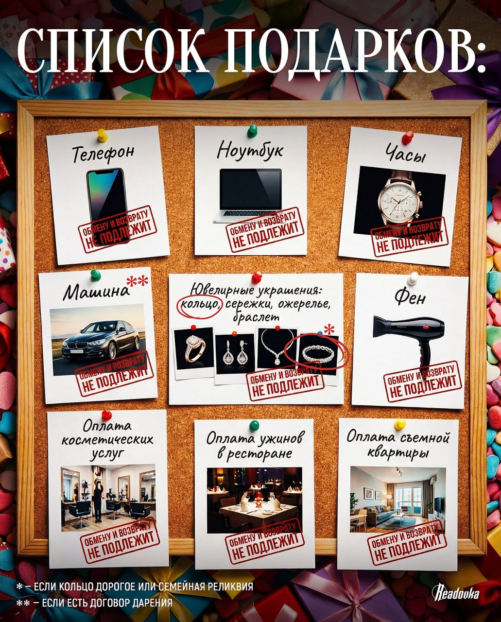 При этом, как отмечает юрист, если подарок был очень дорогим — ориентировочно от 200 тыс, — шанс на его возврат через суд все же есть, но только при наличии доказательной базы. Оплата ресторанов, аренды жилья или косметических услуг, по словам юриста, считается бытовыми расходами и компенсации не подлежит. Особый случай — обручальное кольцо. Его можно потребовать обратно, если брак так и не был заключен. Однако, как отмечает эксперт, вопрос здесь не только юридический, но и этический.