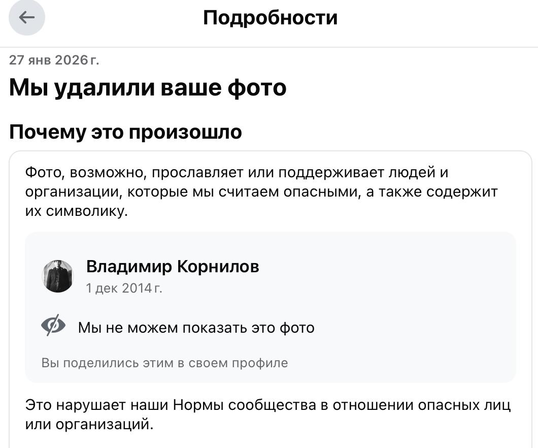 Потрясающе! Я уж лет пять назад ушел с Фейсбука и ничего там не размещаю. А тут мне приходит сообщение от него, что его бдительные модераторы удалили какое-то фото, размещенное мною там 1 декабря 2014 года!