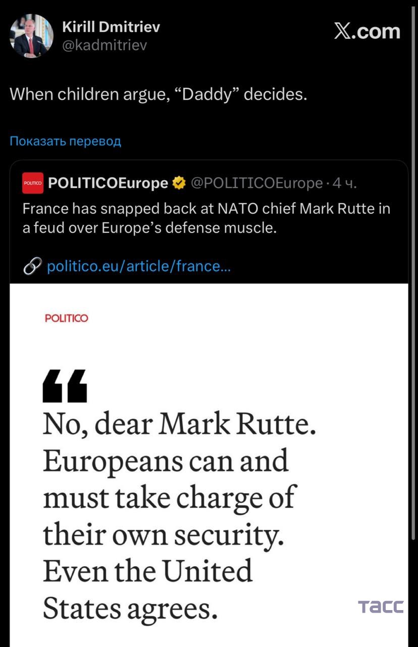 "Когда дети ссорятся, "папочка" решает", — Дмитриев сравнил спор Барро и Рютте с детской ссорой, которую могут рассудить США.