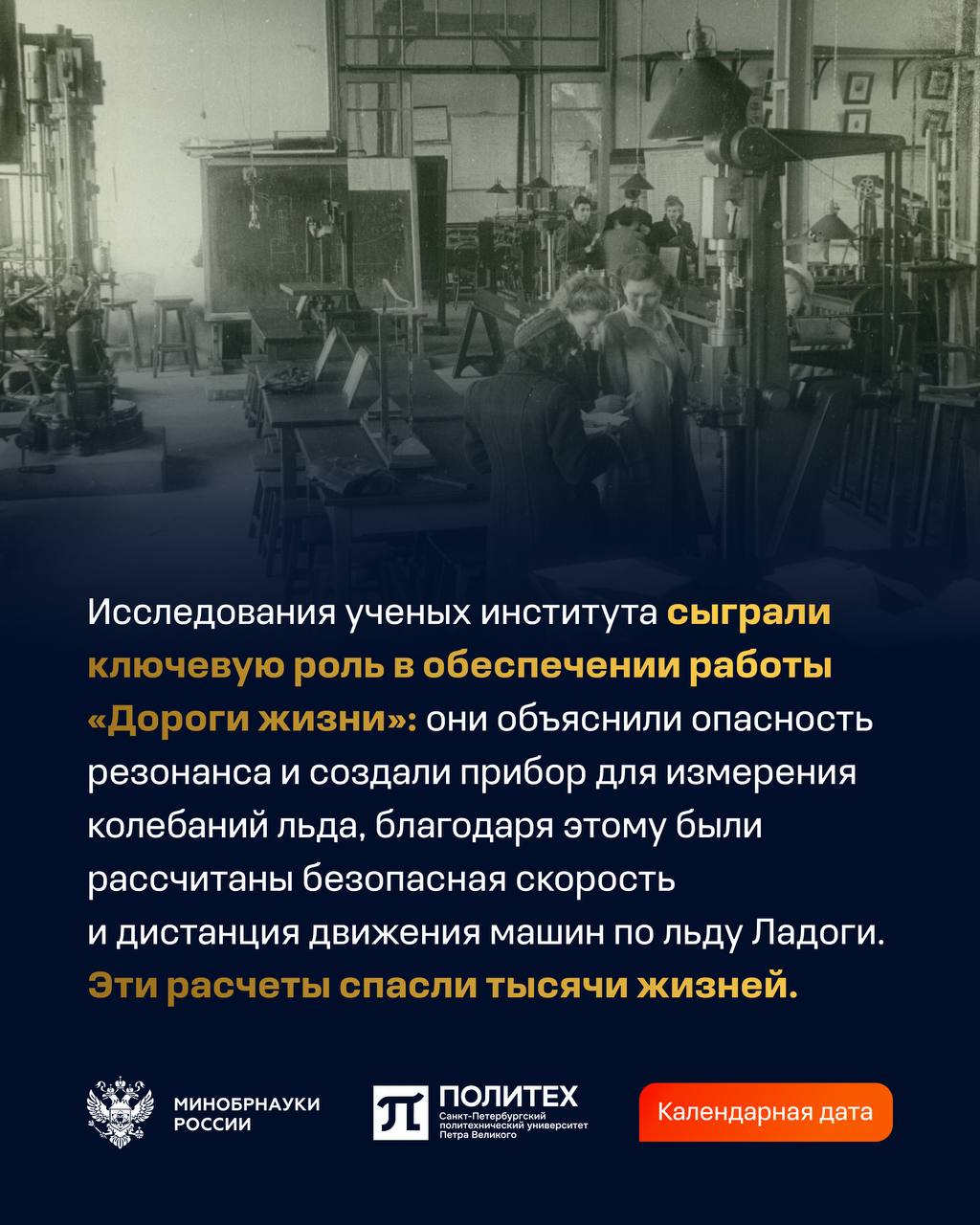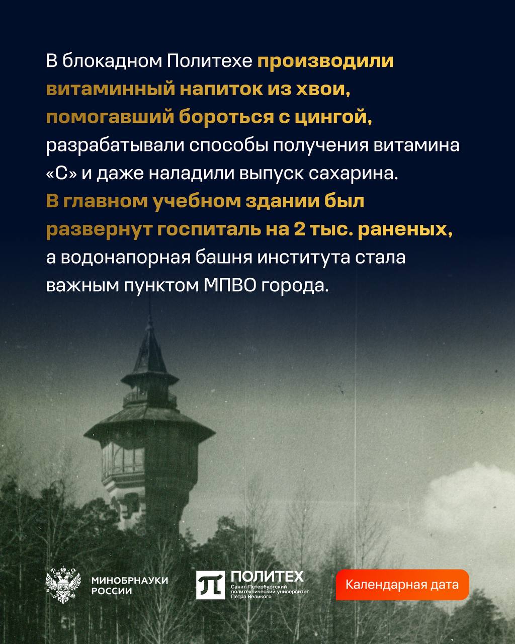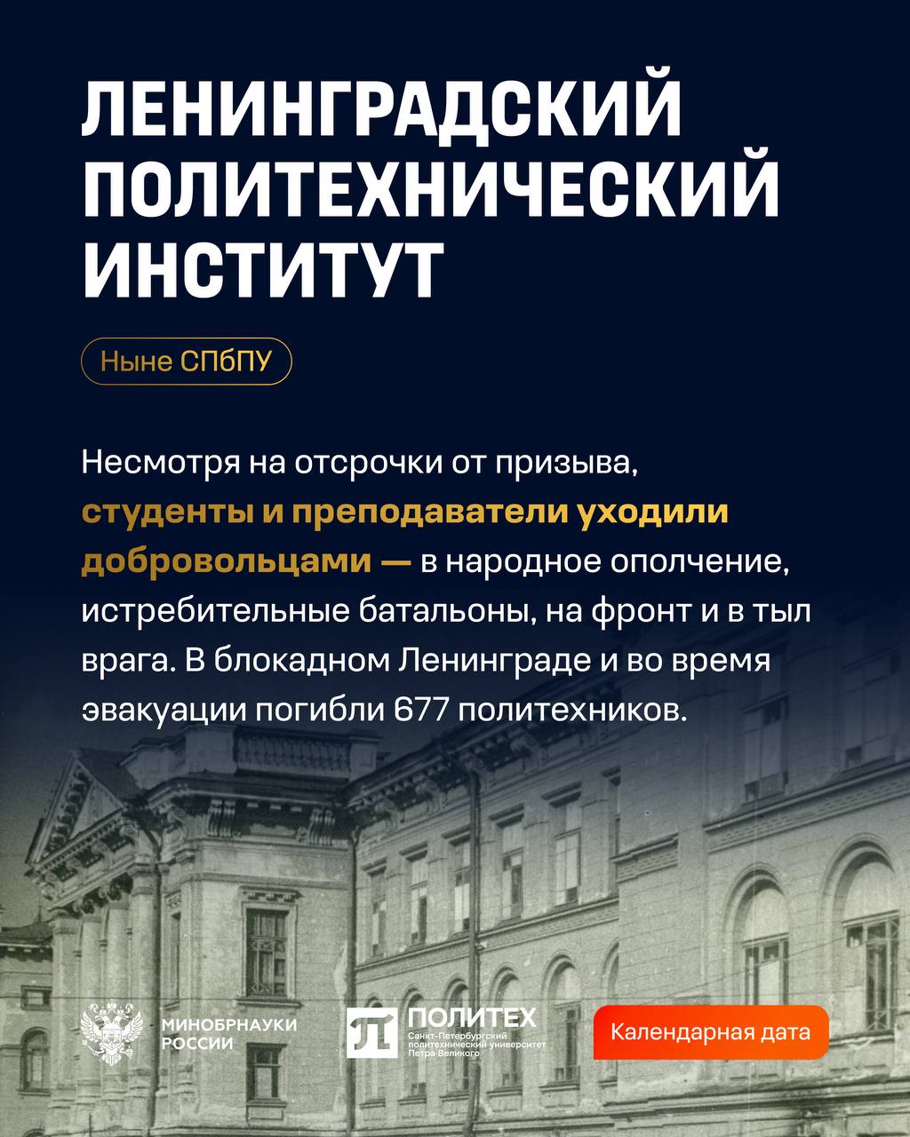 В годы блокады ленинградские вузы продолжали свою деятельность: здесь лечили, рассчитывали «Дорогу жизни»,создавали технологии для фронта и продолжали учить — под обстрелами и в холоде. Санкт-Петербургский политехнический университет Петра Великого и СПбГЭТУ «ЛЭТИ» хранят память об этом подвиге.