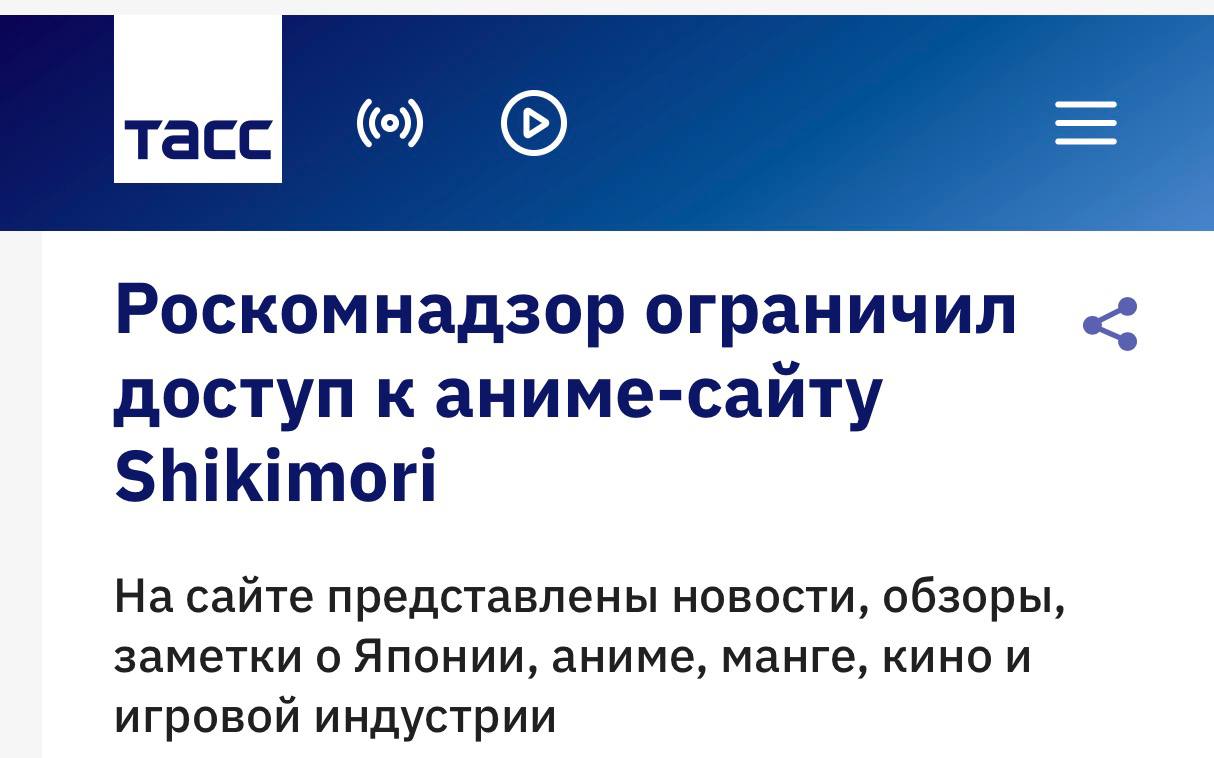 Доступ к сайту с аниме Shikimori ограничен на территории России, следует из данных сервиса Роскомнадзора для проверки ограничения доступа к сайтам и страницам в сети