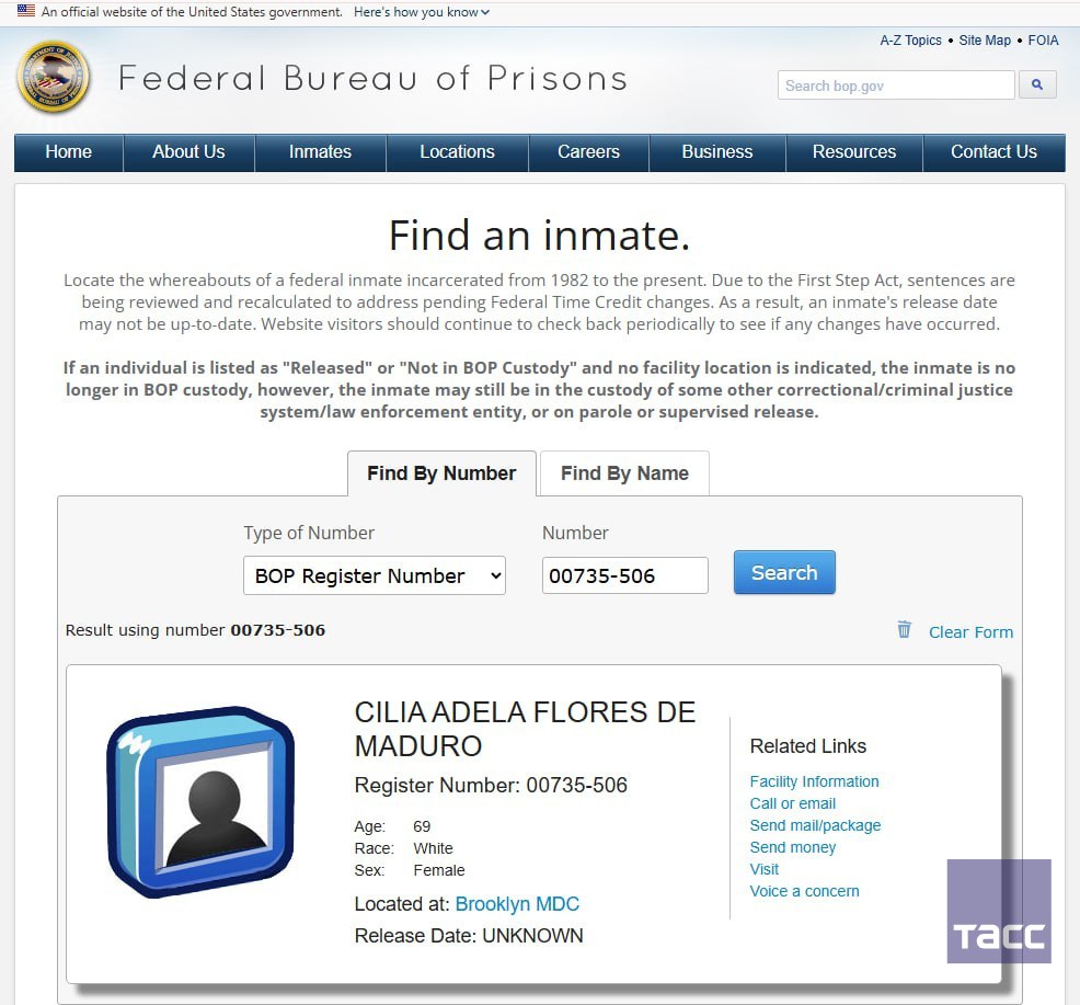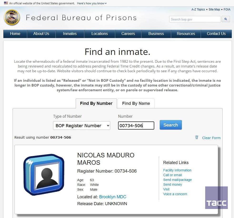 В тюрьме в Бруклине вместе с Мадуро и Силии Флорес содержится еще 1319 заключенных, следует из данных Федерального бюро тюрем США, с которым ознакомился ТАСС.