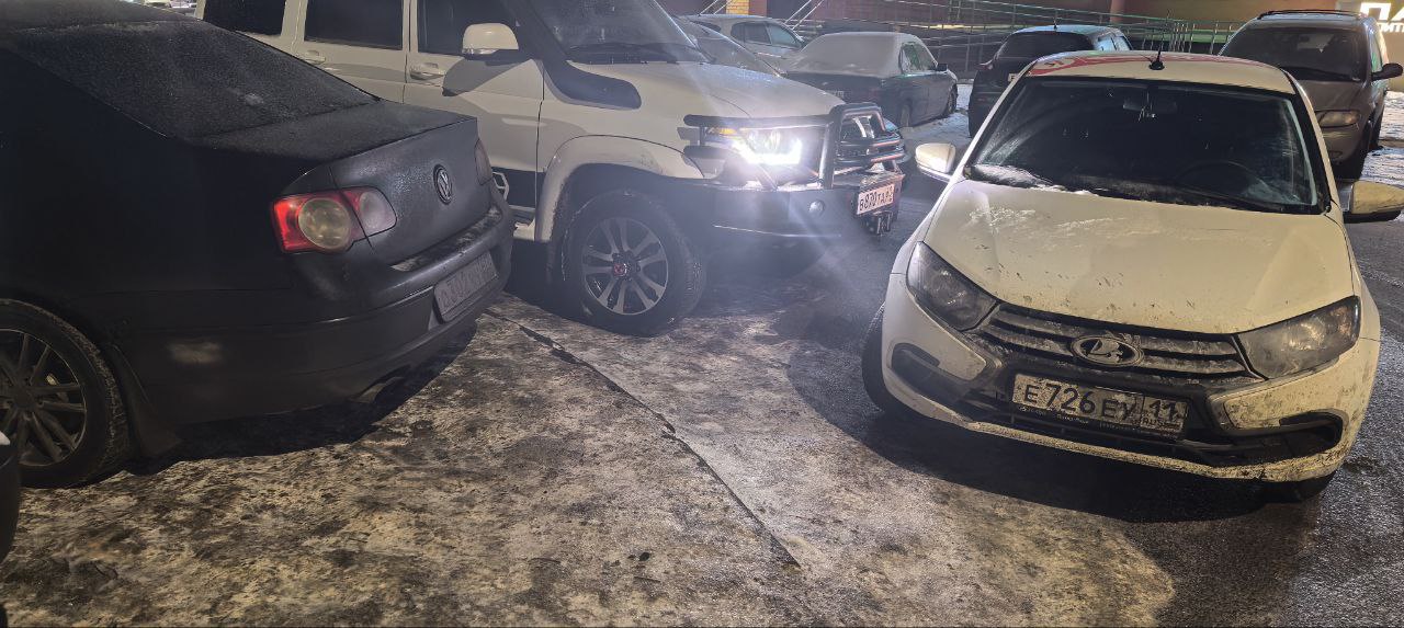 Какой-то умник, видимо, решил, что может парковаться, как ему угодно. Нет, это не «доставка подъехала, сейчас отъедет». Классическая парковка на ночь. Ничего не шевельнулось в голове обладателя «Гранты» — просто взял и заблокировал выезд нескольким авто.