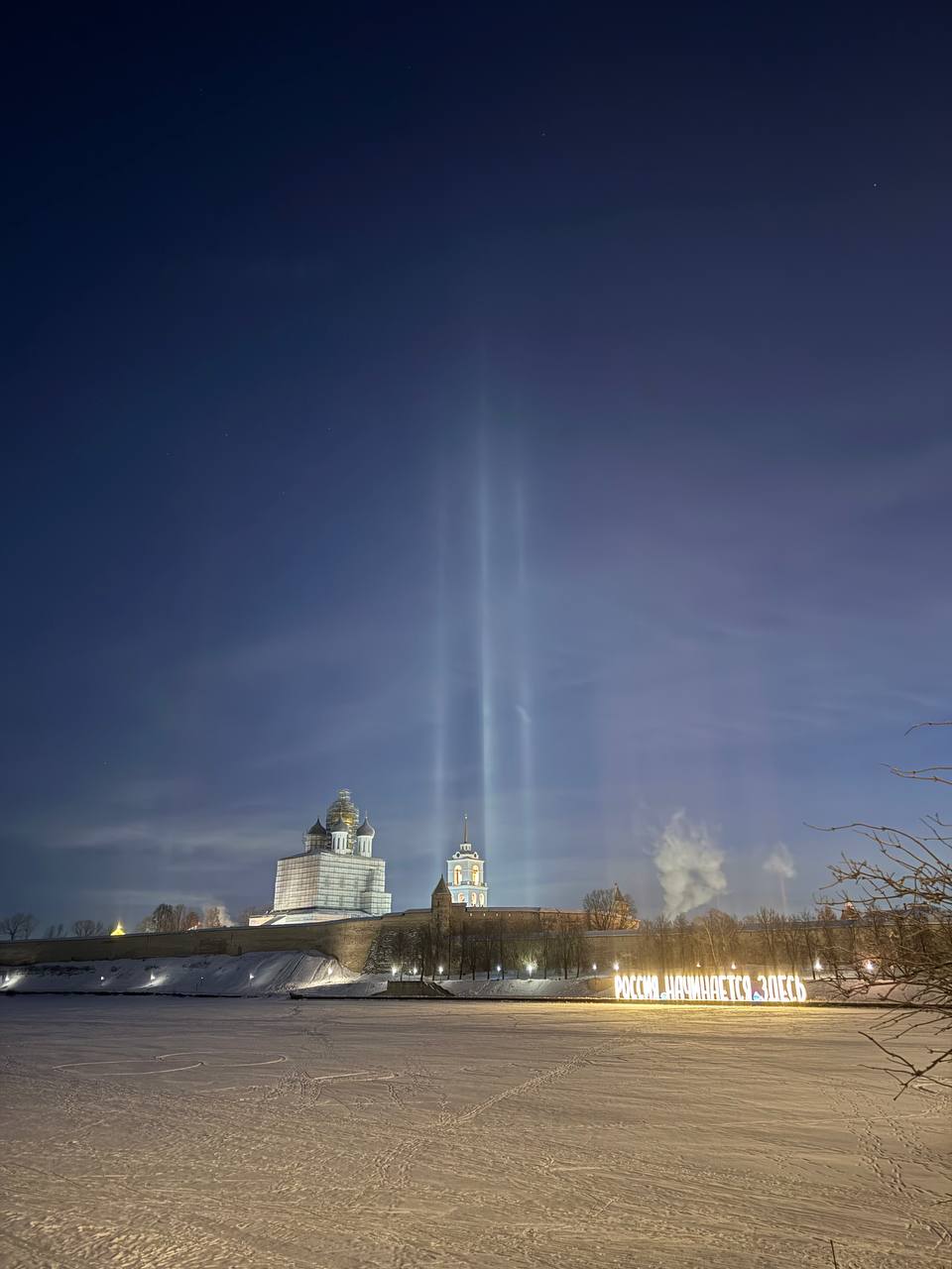 1234Наша подписчица прислала необычные фотографии ночного Псковского Кремля, на которых три световых столба поднимаются в небо, создавая впечатляющий контраст с темным небом.