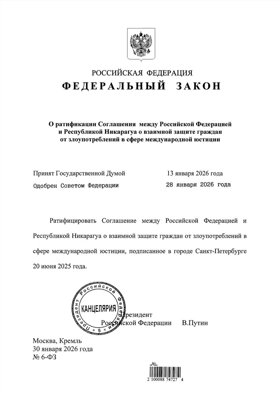 Соглашение между Российской Федерацией и Республикой Никарагуа о взаимной защите граждан от злоупотреблений в сфере международной юстиции;