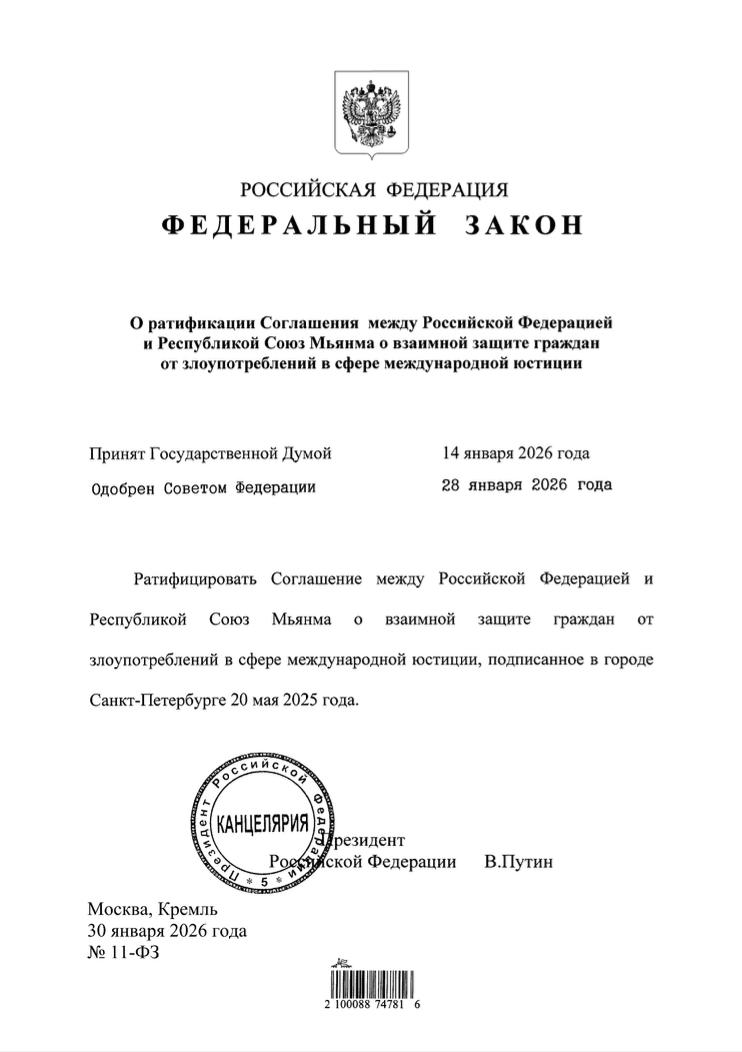 Соглашение между Российской Федерацией и Республикой Союз Мьянма о взаимной защите граждан от злоупотреблений в сфере международной юстиции.
