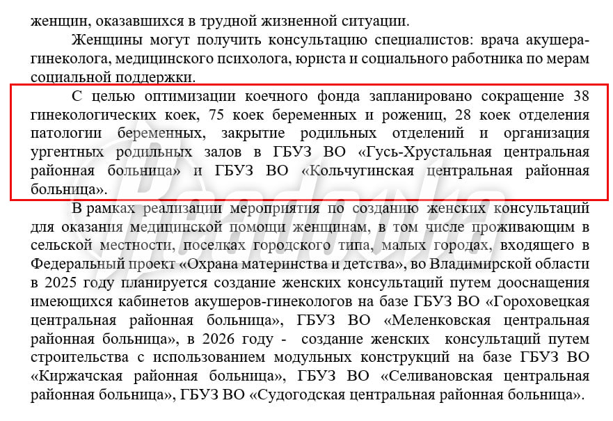 После закрытия районных отделений именно туда предполагается перераспределить потоки рожениц. При этом во Владимирской области проживает около 250 тыс женщин репродуктивного возраста, которые потенциально еще могут родить. Это вызывает вопросы о готовности системы справляться с возможным ростом нагрузки. Однако Минздрав Владимирской области в документе отметил, что самая репродуктивная группа — женщины в возрасте от 30 до 34 лет, а их число составляет 47 тыс человек.