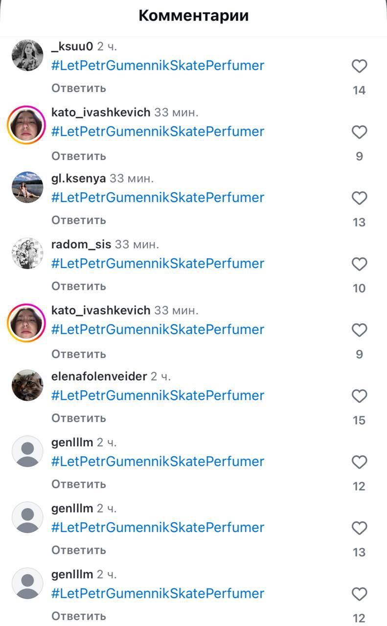 В МОК все вопросы по этому поводу адресовали фигуристу. Тем временем болельщики в соцсетях спамят комментариями с хештегом «Разрешите Петру Гуменнику кататься под „Парфюмера“».
