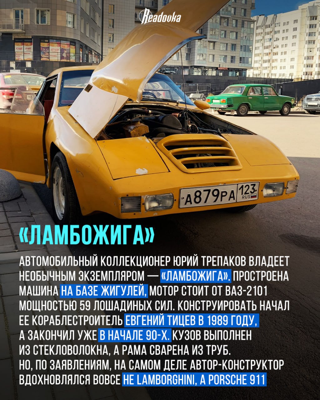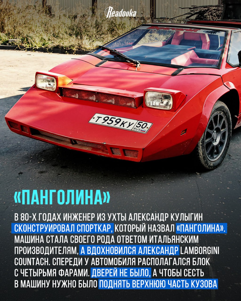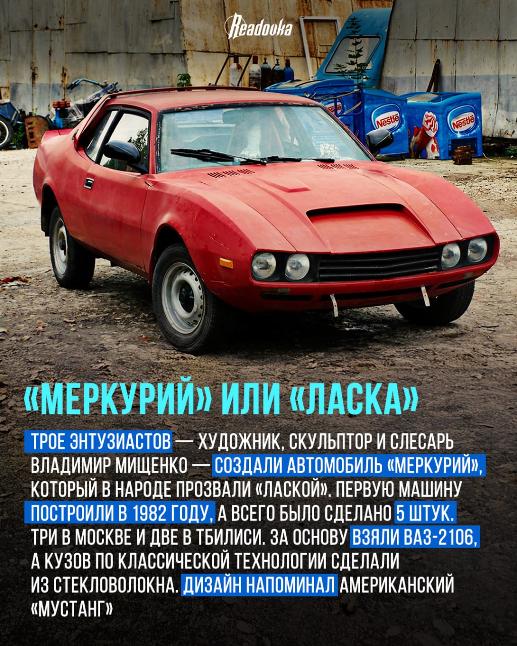 На карточках Readovka представлены несколько таких машин от точных копий культовых моделей до футуристичных спорткаров, собранных с нуля. Их создатели не имели крупных бюджетов или заводских цехов, а полагались лишь на смекалку и свои руки.