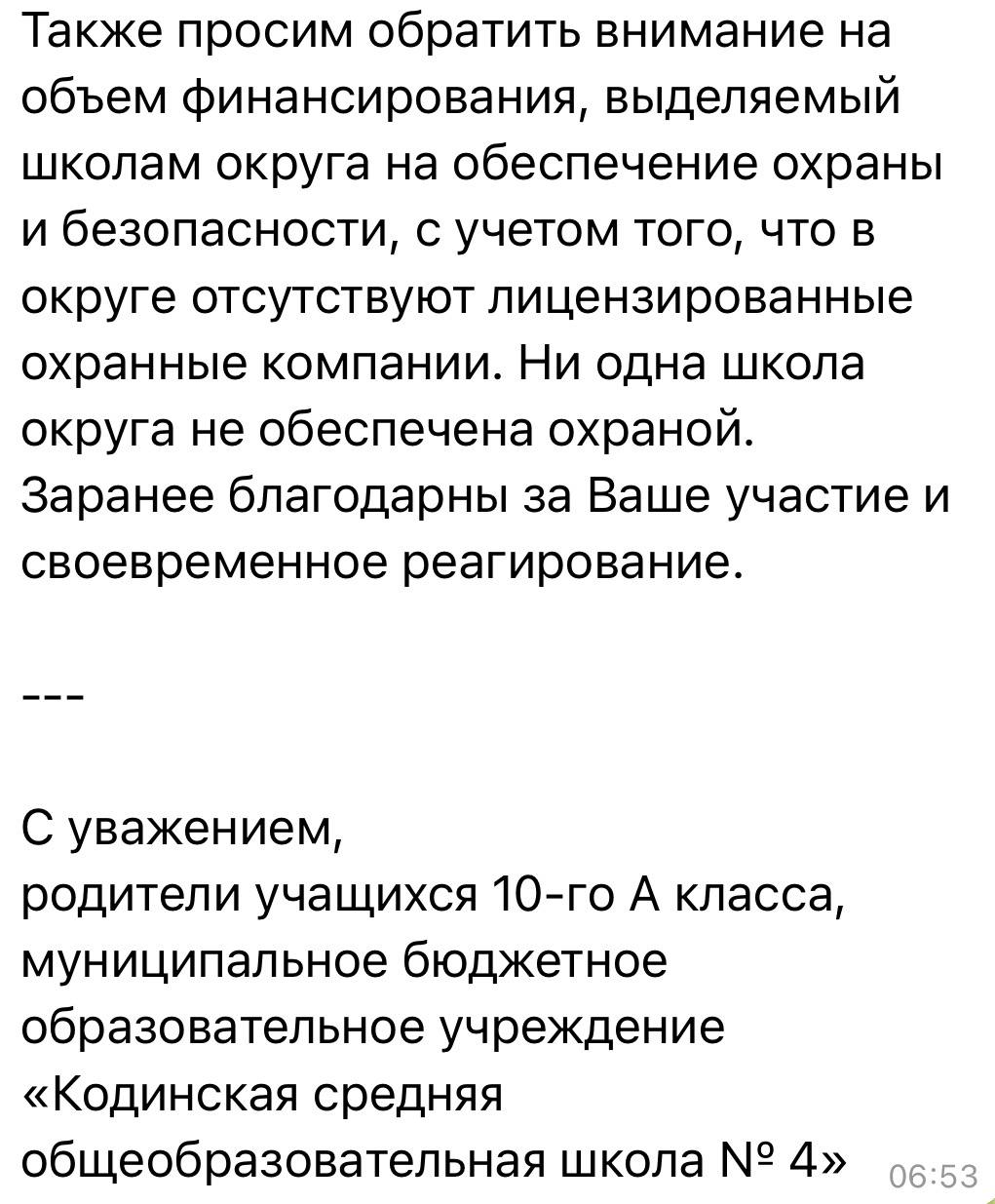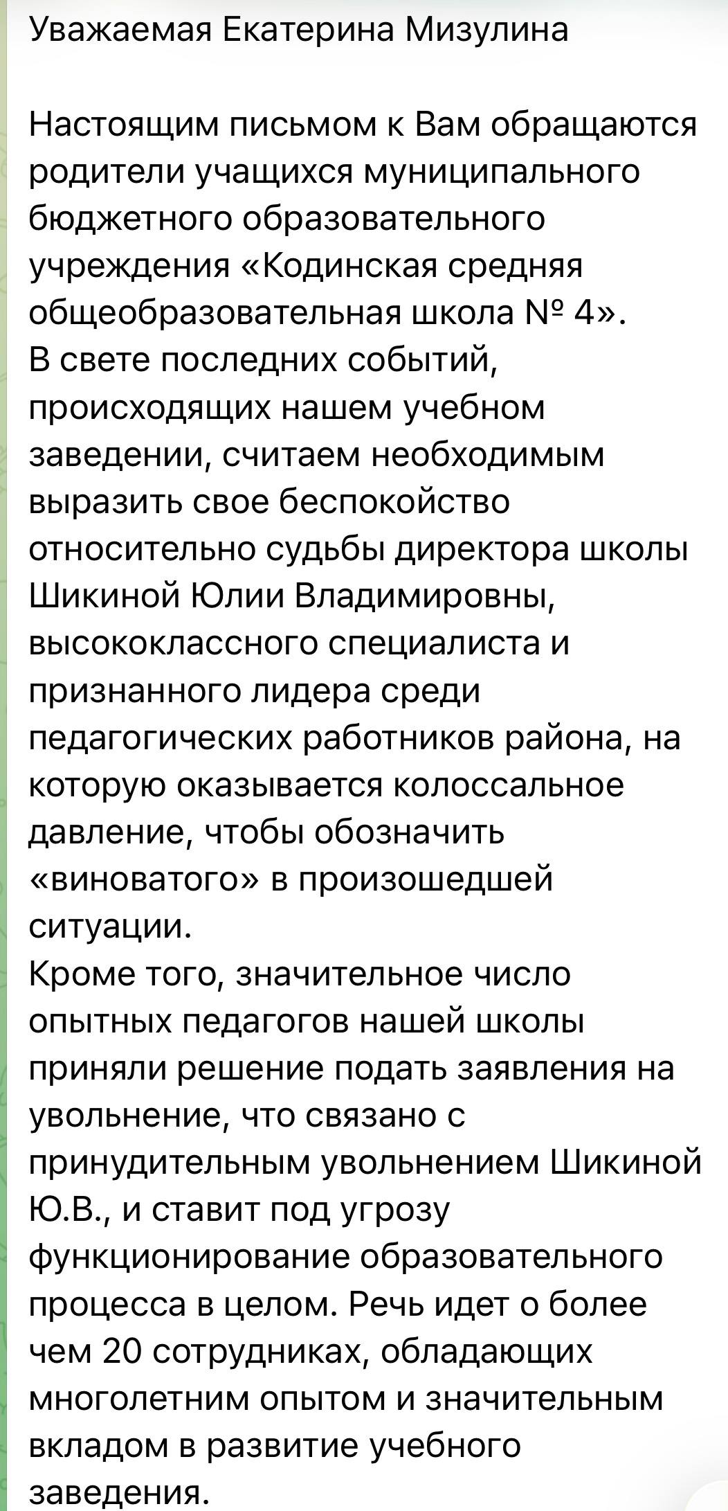 Родители просят не увольнять директора кодинской школы после нападения ученицы. Сегодня мне пришло от них коллективное обращение.