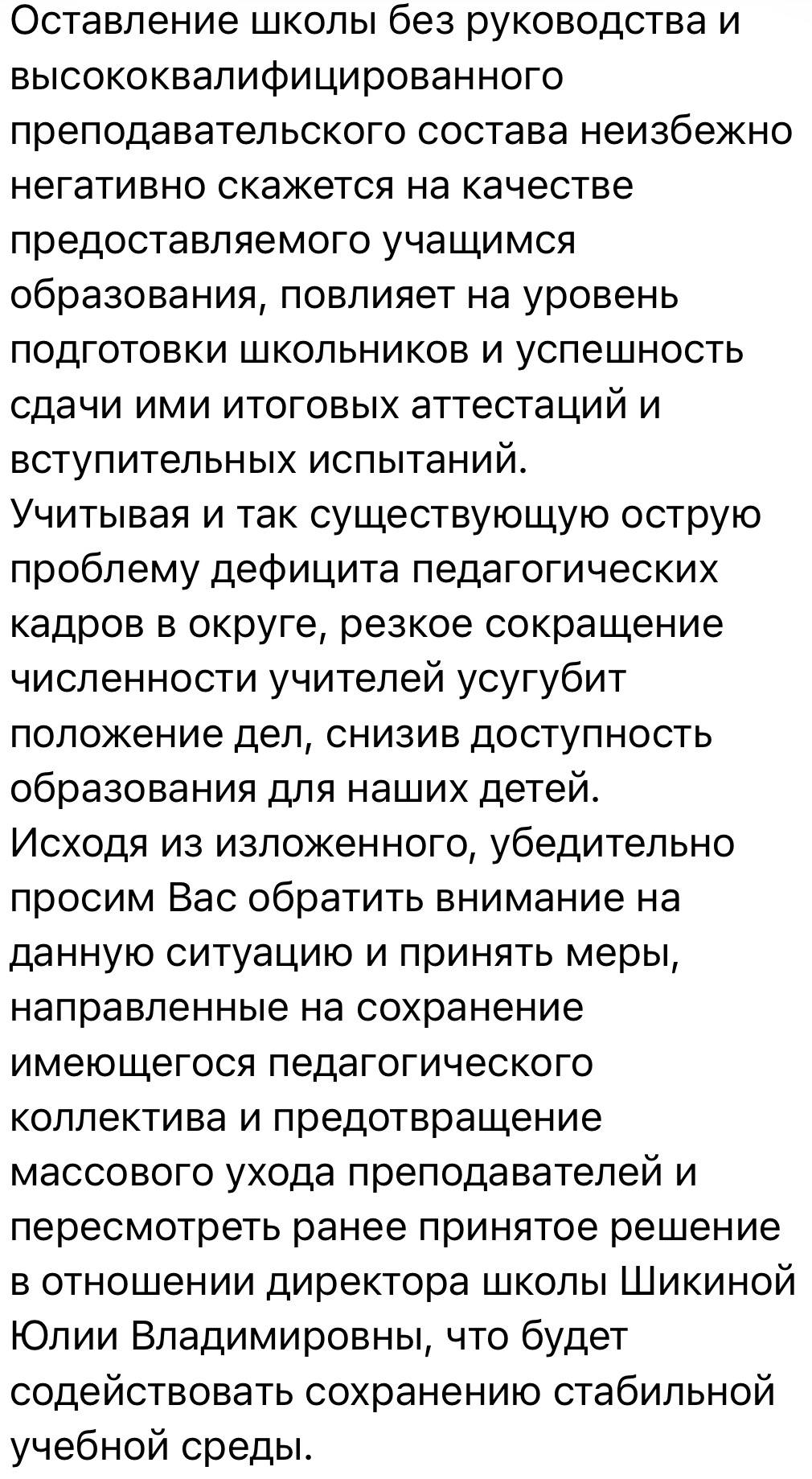 В письме родители просят не увольнять директора, а ограничиться дисциплинарным взысканием. По их словам, около 20 опытных педагогов уже написали заявления на увольнение. Для самой крупной школы города, где учатся 800 человек, это будет крайне ощутимо: перевести детей некуда, другие школы укомплектованы, а найти новых учителей в округе быстро не получится. А дети тем временем готовятся к ОГЭ и ЕГЭ. Кроме того, родители обращают внимание и проблему с охраной учебного заведения.