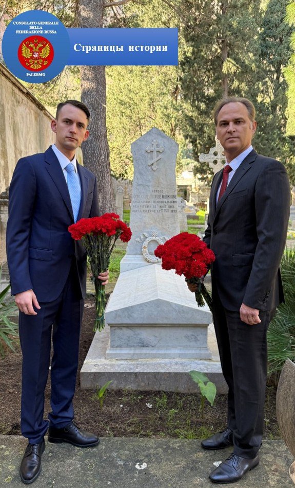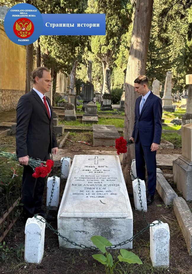 Накануне Дня Дипломатического работника на Английском кладбище в Палермо дипломатический состав Генконсульства России в Палермо отдал дань памятиГенеральным консулам Российской Империи на Сицилии: Н.И.Мухину (1862-1880 гг.) и Н.В.Тимофееву (1881-1886 гг.), возложив цветы к их могилам .