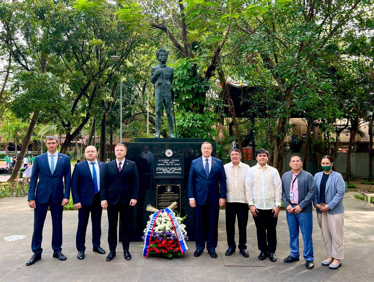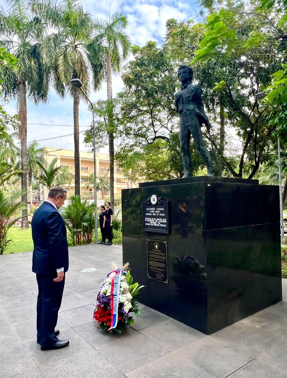 10 февраля в День дипломатического работника Посол России на Филиппинах М.И.Павлов возложил цветы к расположенному на территории Манильского университета памятнику А.С.Пушкину, служившему на протяжении 12 лет в российском внешнеполитическом ведомстве.