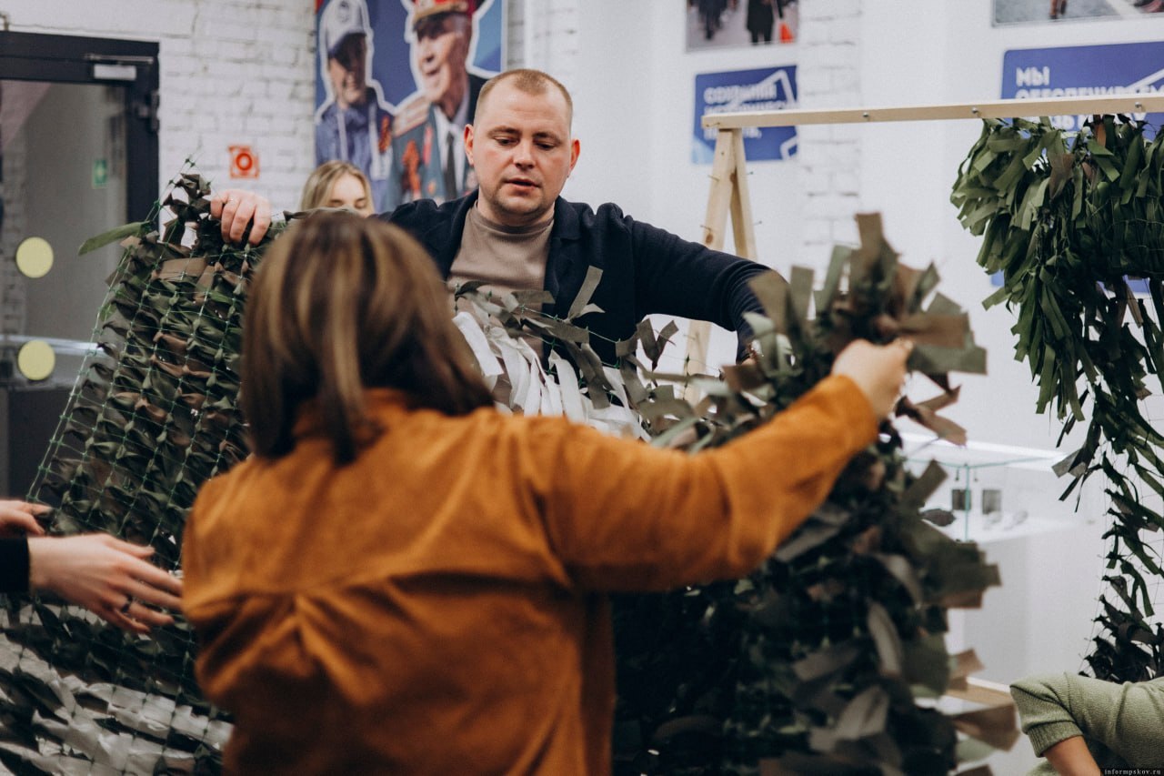 Дмитрий принял непосредственное участие в изготовлении маскировочных сетей вместе с волонтёрами Ресурсного центра «Добро.рф» Псковской области. Работая плечом к плечу с добровольцами, он поделился своими воспоминаниями и ценными рекомендациями, основанными на боевом опыте.