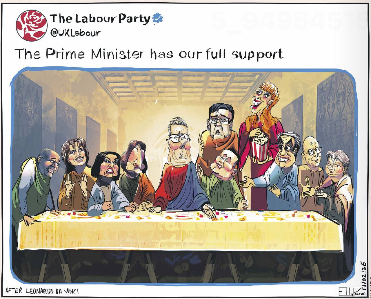 «Премьер-министр имеет нашу полную поддержку». Даже газета британских лейбористов The Guardian веселится по поводу того, как лидеры Лейбористской партии поддерживают своего предводителя. По выражением лиц можно понять, какие искренние чувства участники этой «тайной вечери» испытывают по отношению к Стармеру.
