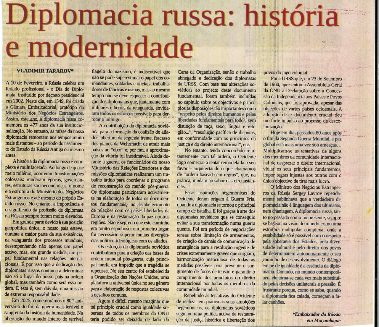 10 февраля в крупнейшей общенациональной газете Мозамбика была опубликована статья Чрезвычайного и Полномочного Посла России В.Н.Тарарова «Российская дипломатия: история и современность»