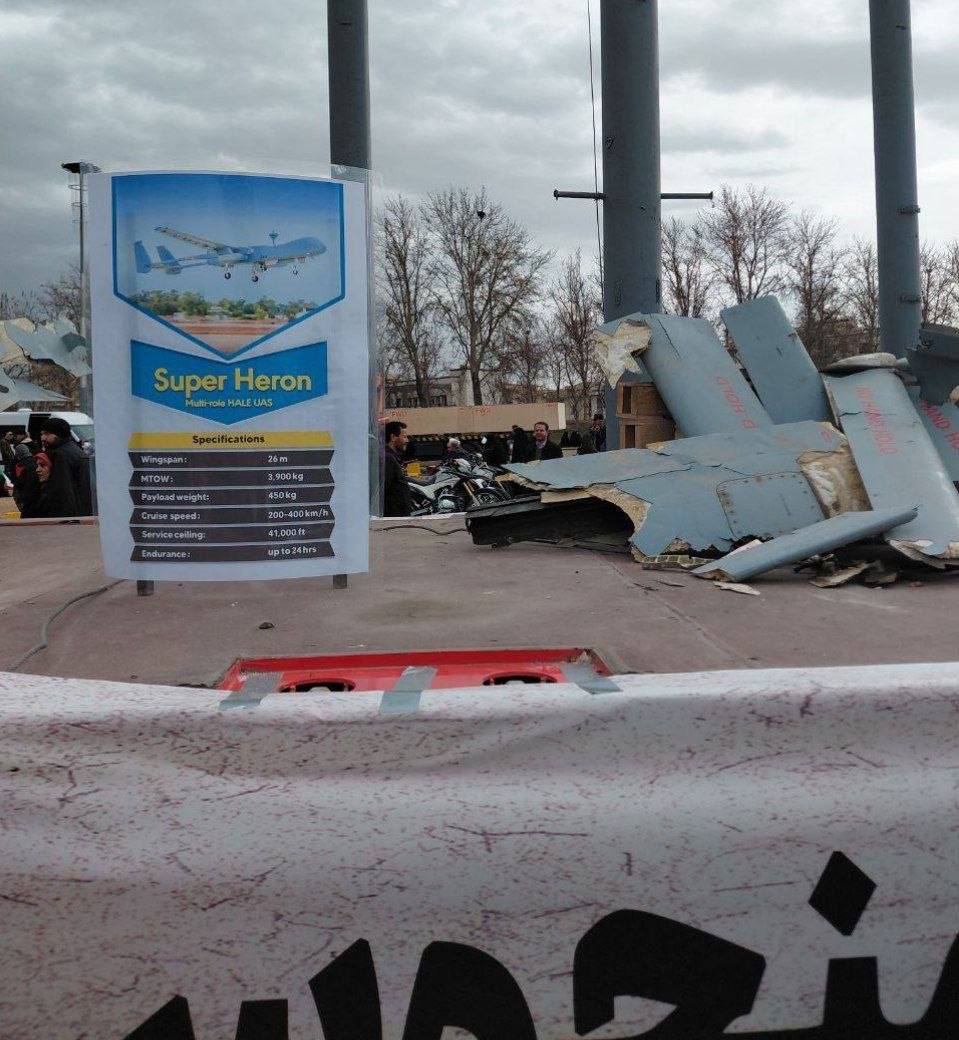 Куча обломков израильских БПЛА Super Heron выставленная в центре Тегерана. Дроны были сбиты во время летней войны 2025 года.