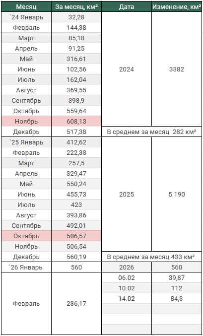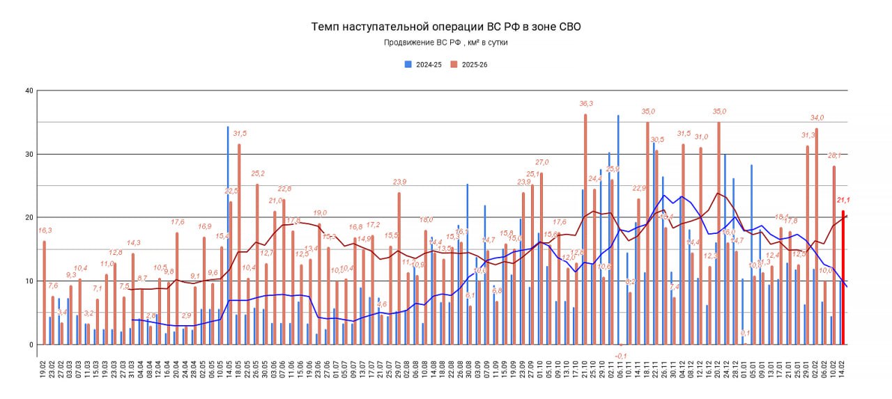 Обновление по данным c 10 по 13 февраля 2026. Темп продвижения +21,1 км в сутки за период, общее продвижение 84,3 км.