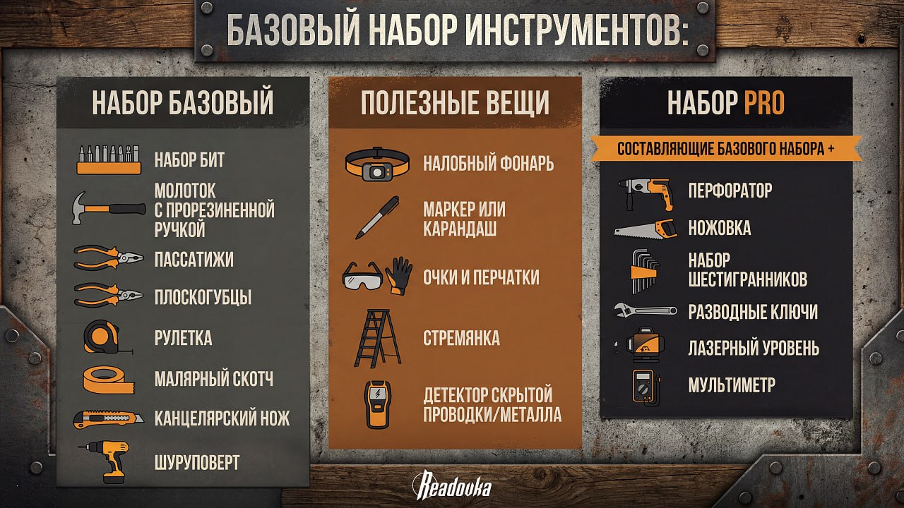 Если он не помещается на таком небольшом пространстве — это уже не «база», а хобби, считает эксперт. Кроме инструментов, можно добавить вещи, которые экономят время и спасают от ошибок: