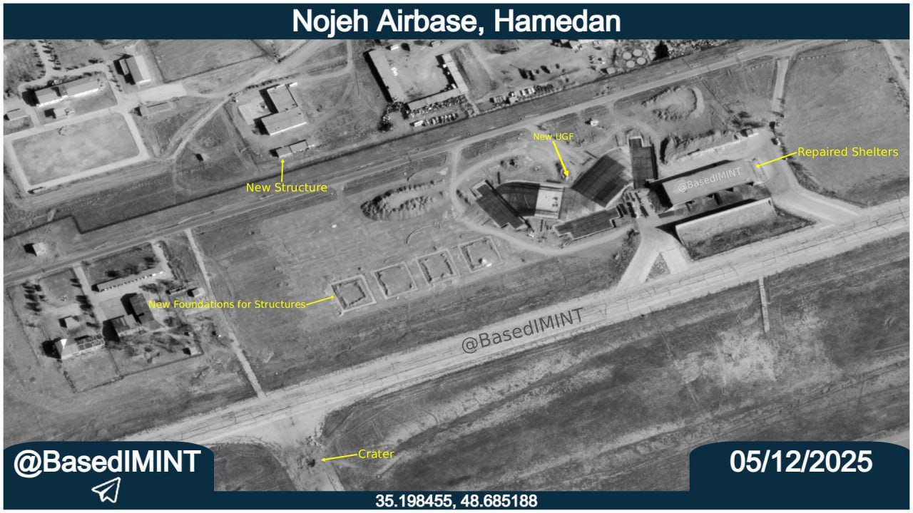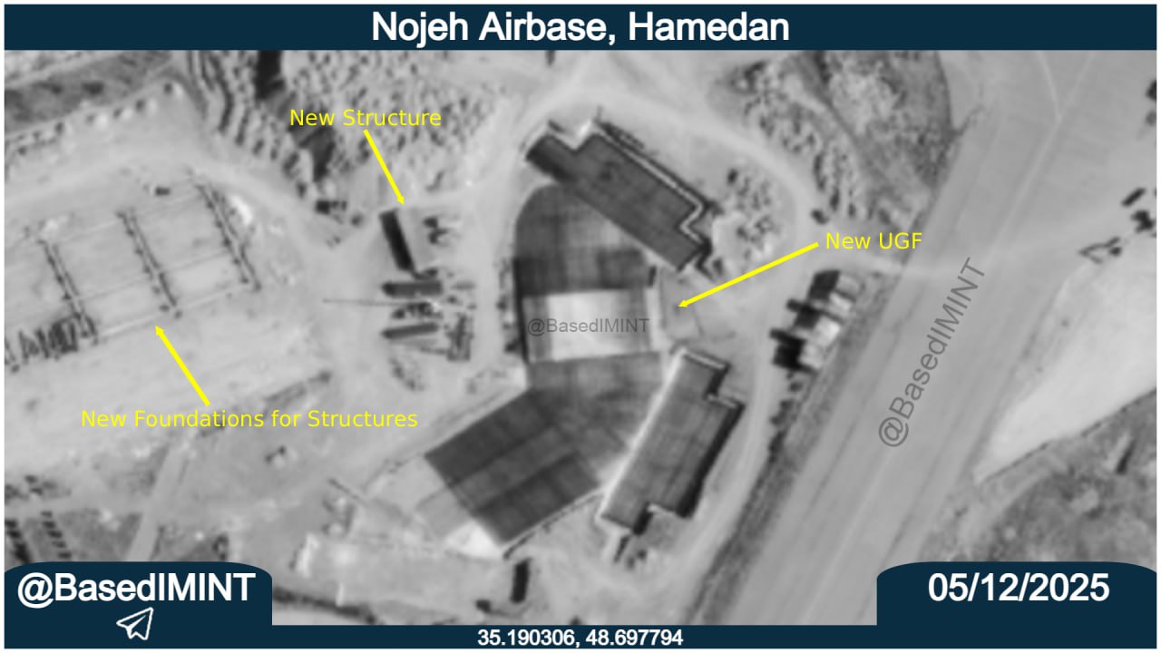 Спутниковые снимки от декабря 2025 года базы ВВС Нодже показывают, что укрытия, повреждённые в ходе 12-дневной войны, были отремонтированы и вновь введены в эксплуатацию, а также наблюдается строительство двух новых подземных сооружений, которые, возможно, предназначены для лифтовых ангаров для самолётов. Эти лифтовые ангары предназначены для истребителей SU-35, и это сделано с целью предотвращения их уничтожения при любом воздушном нападении.