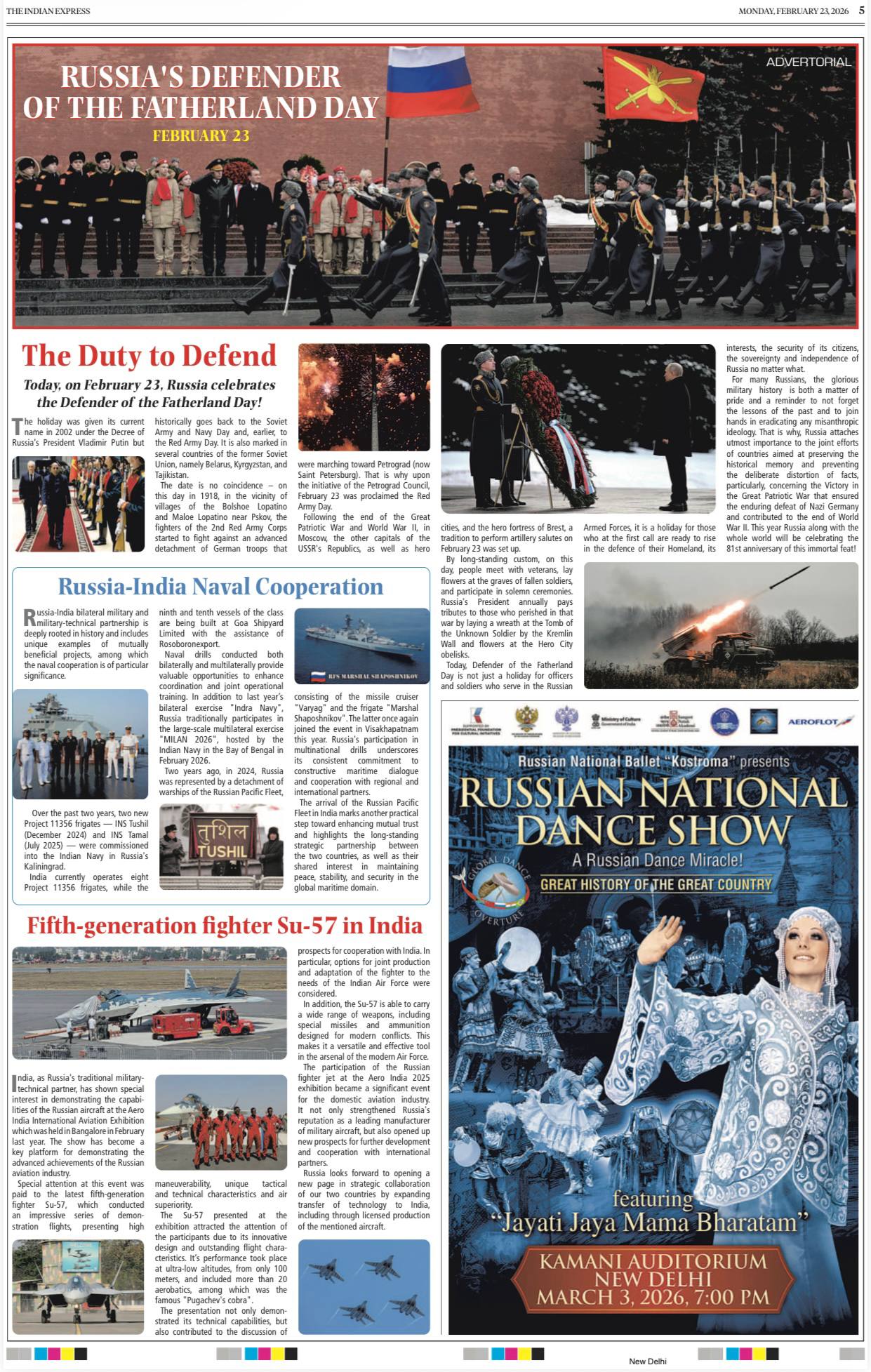 Сегодня, 23 февраля в индийских газетах "Индиан Экспресс"и "Файненшл Экспресс" вышла полоса, посвященная Дню защитника Отечества!