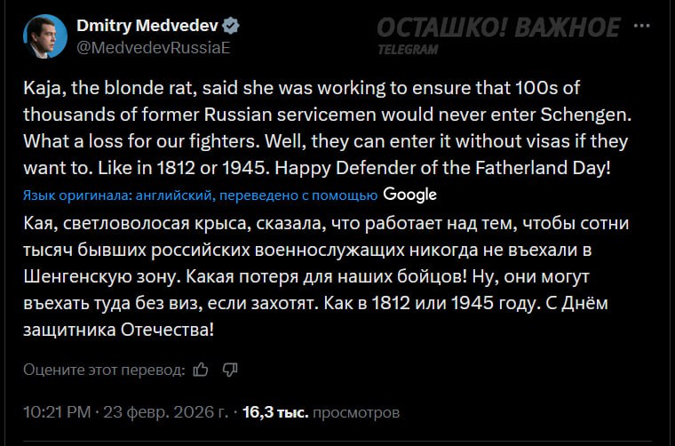 В ответ на заявление главы евродипломатии Каи Каллас о работе над полным запретом выезда участникам СВО в ЕС зампред Совбеза России Дмитрий Медведев отреагировал постом в .