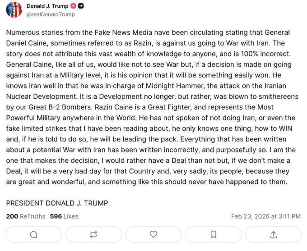 Дональд Трамп в своём заявлении жёстко ответил СМИ, что генерал Дэниел Кейн (глава Объединённого комитета начальников штабов) не выступает против операции против Ирана.