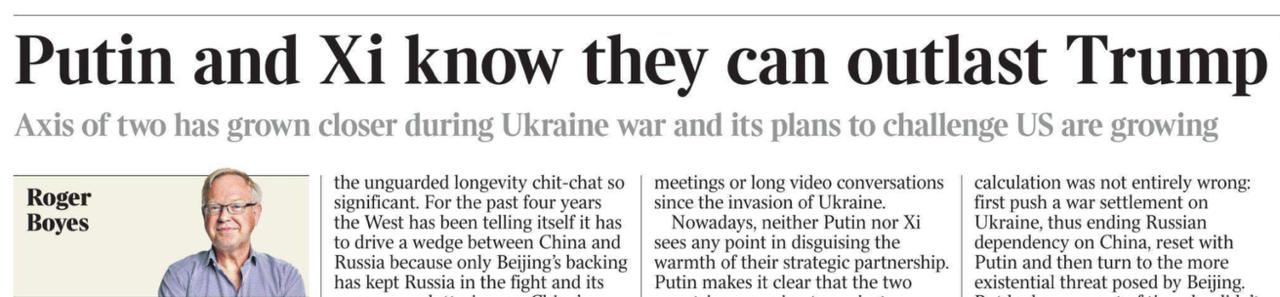 «Путин и Си знают, что они могут пережить Трампа». Под таким жизнеутверждающим заголовком публикует свою чудесную «аналитику» ведущий внешнеполитический колумнист The Times Роджер Бойес.