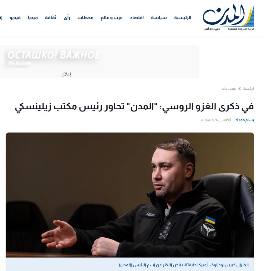 Руководитель разведки Украины, террорист и глава офиса Зеленского, Кирилл Буданов заявил в интервью арабскому агентству «Аль-Модон»: