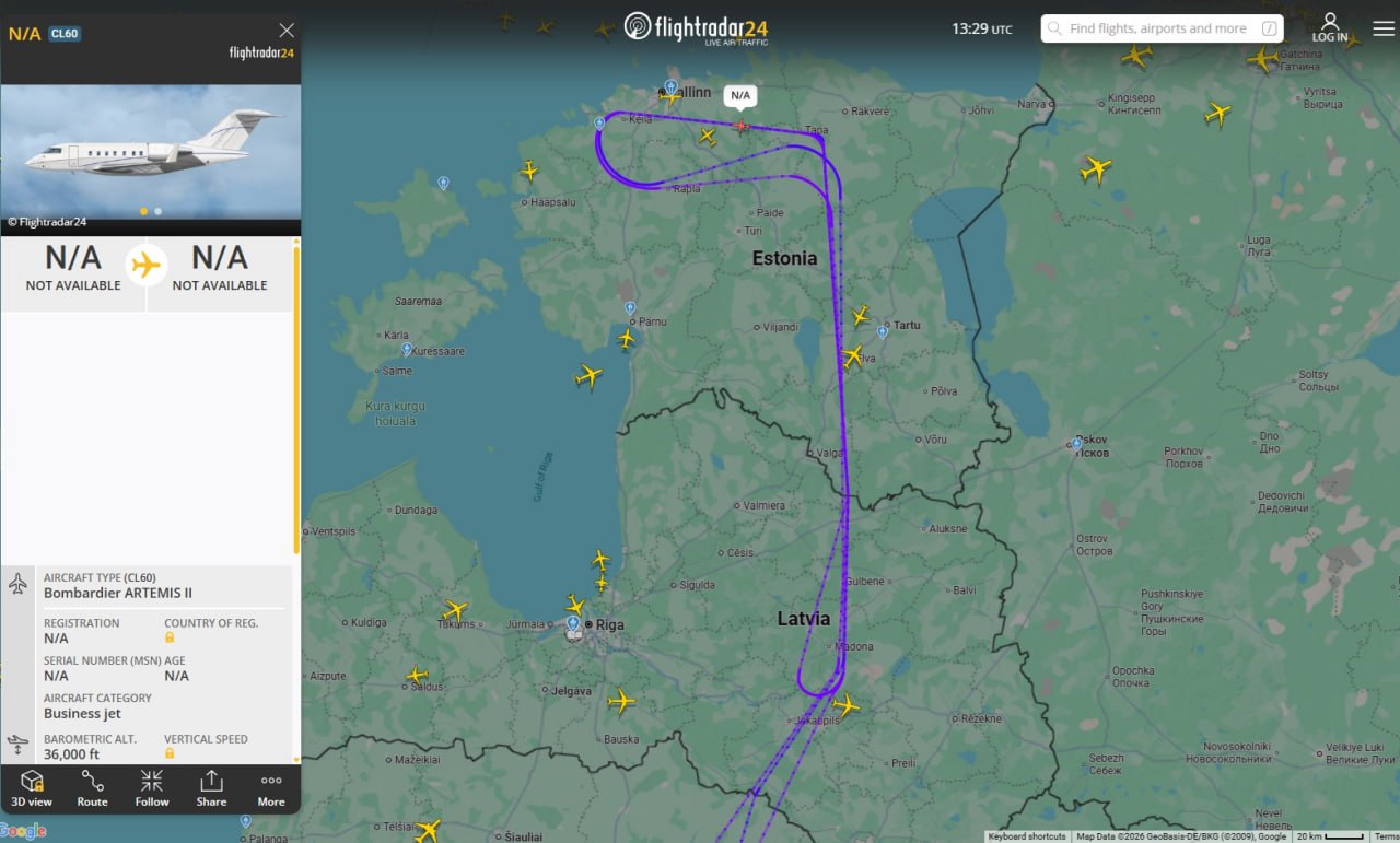 Вдоль границы НАТО с Псковской областью сегодня весь день летает разведывательный Bombardier Artemis II