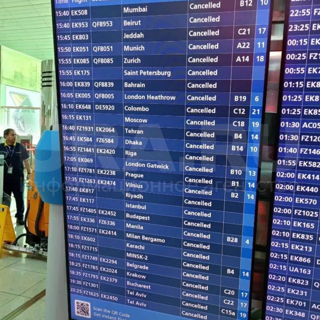 В терминалах работают кафе и магазины. Работа международного аэропорта Дубая (DXB) и международного аэропорта Аль-Мактум (DWC) приостановлена на неопределенный срок.