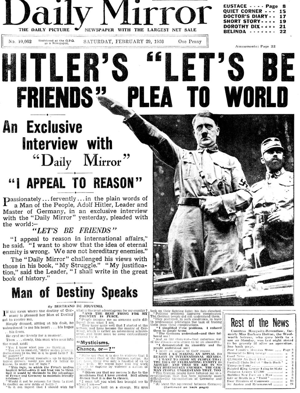 90 лет назад (29 февраля 1936 года) британская Daily Mirror опубликовала восторженное эксклюзивное интервью с Гитлером, восхваляя его мудрость и призывая Британию быть его союзником. Один заголовок чего стоит: «Говорит Человек Судьбы».