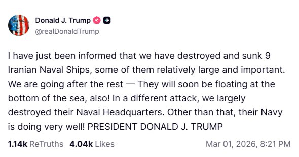 «Мне только что сообщили, что мы уничтожили и потопили 9 иранских военных кораблей, некоторые из которых были достаточно крупными и важными. Мы собираемся уничтожить и остальные — скоро они тоже будут лежать на дне моря! В остальном, их флот показывает себя очень хорошо!»