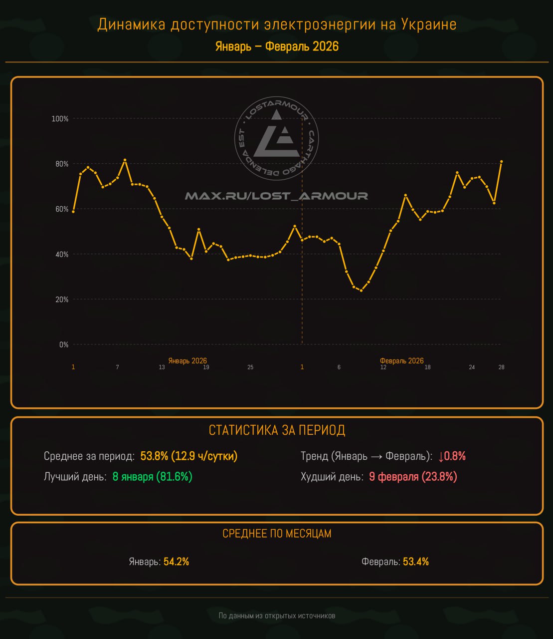 Как мы видим на графике «доступности электроэнергии для украинских потребителей в %», началось оно в аккурат после Рождества и достигло своего пика 9 февраля. Когда к электроэнергии было подключено менее четверти украинских потребителей.