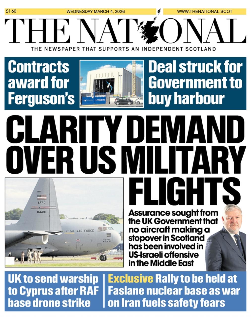 Шотландская пресса бурлит по поводу решения Стармера позволить использование британских военных баз для операции против Ирана. Газета шотландских националистов The National требует гарантий того, что базы, находящиеся в Шотландии, в этих операциях не будут задействованы.