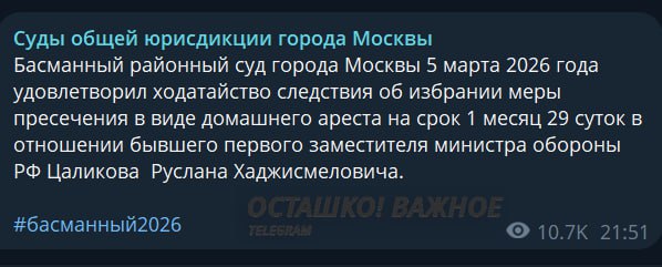 Басманный суд отправил Руслана Цаликова под домашний арест на 1 месяц и 29 суток, — сообщила пресс-служба судов Москвы. Он был вторым человеком в министерстве после Сергея Шойгу, а теперь обвинён по 12 эпизодам растраты бюджетных средств, 2 эпизодам получения взятки, а также в отмывании денег.