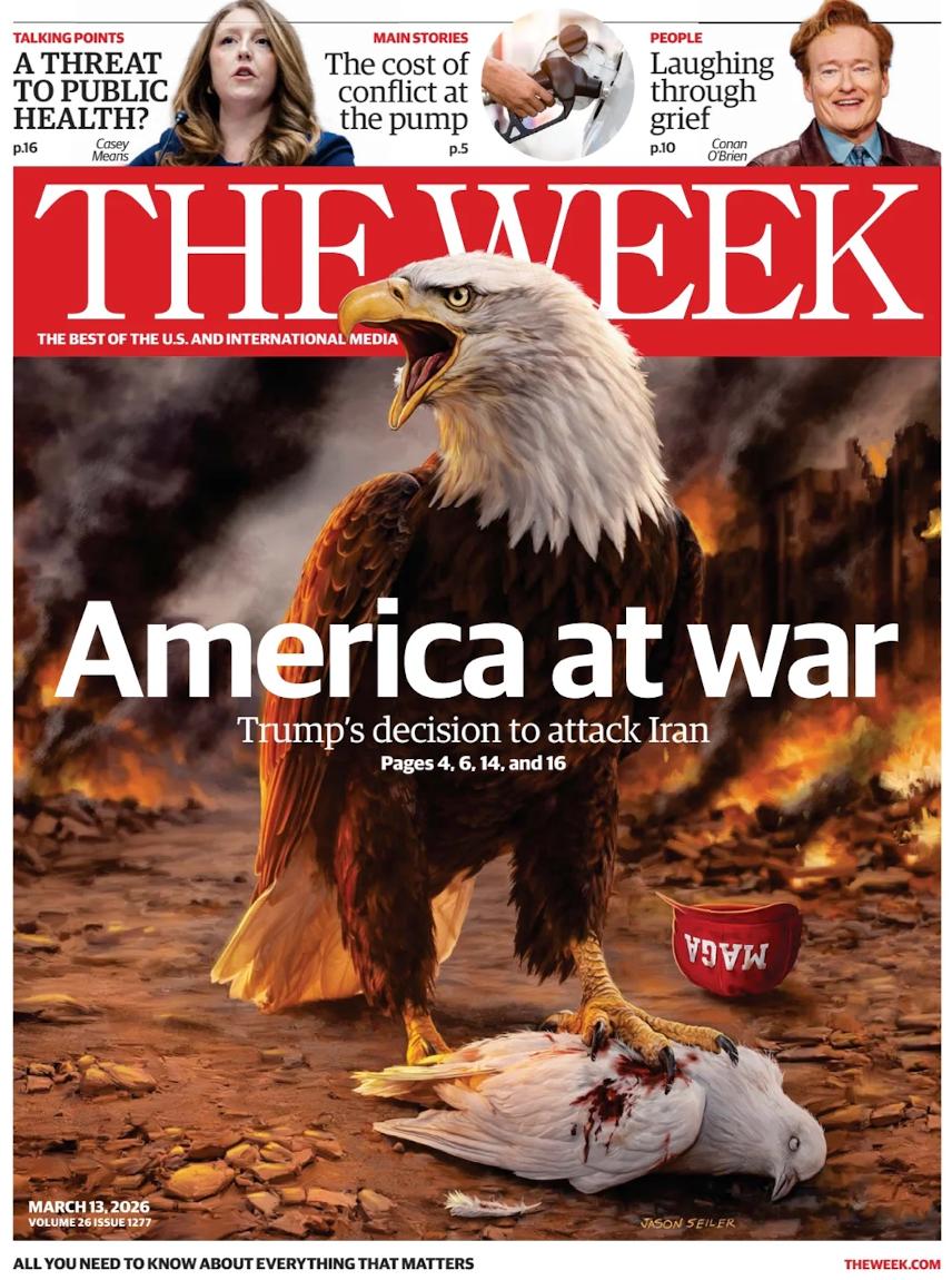 «Америка на войне». Новая обложка американского еженедельника The Week. Как видите, не только белый голубь мира растерзан американским орлом. Там еще и кепка MAGA догорает.