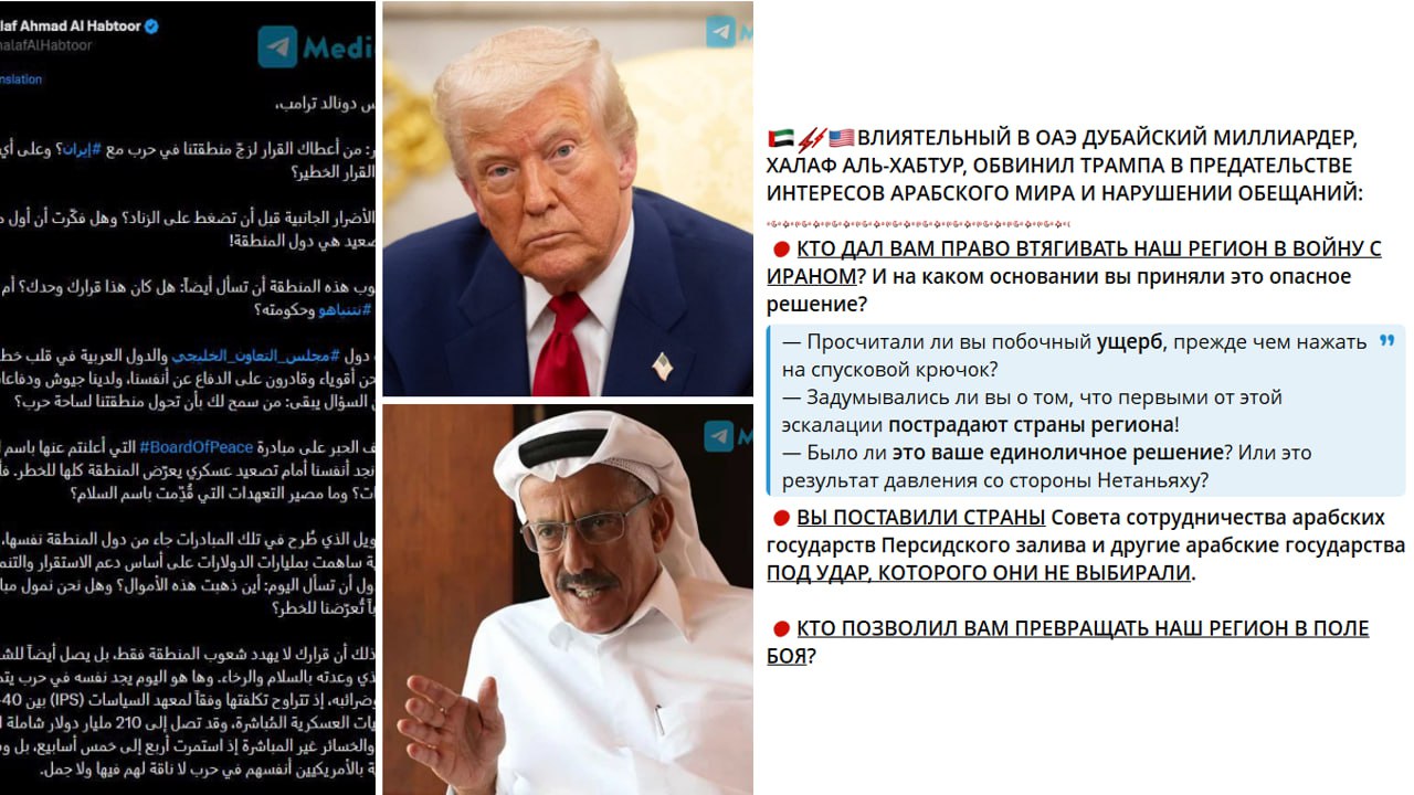 Например, вот гневное публичное обращение к президенту США эмиратского миллиардера Халафа Аль-Хабтура. Который до начала войны обладал состоянием чуть менее 1,5 млрд.$.