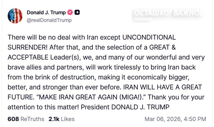 «Безоговорочная капитуляция!»: Трамп требует Иран сдаться и обещает «сделать его снова великим»