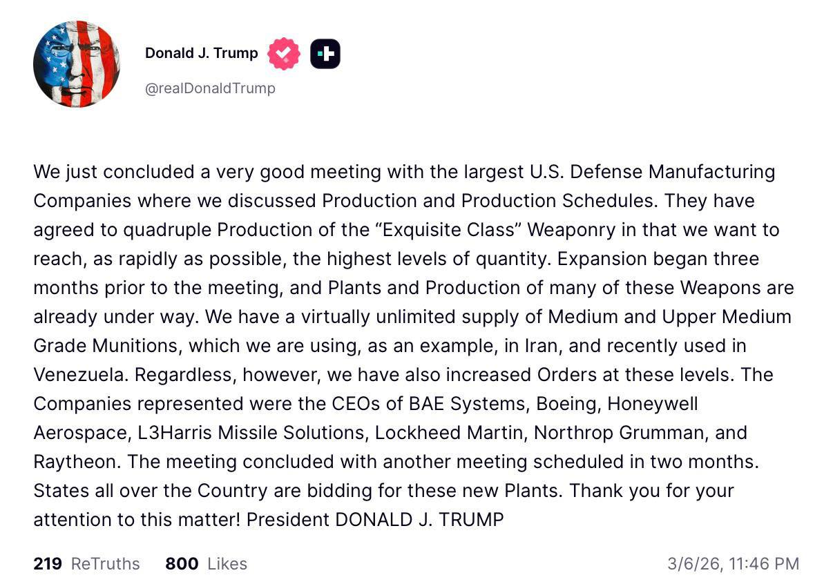 Трамп встретился с боссами оружейных компаний: производство вырастет в 4 раза