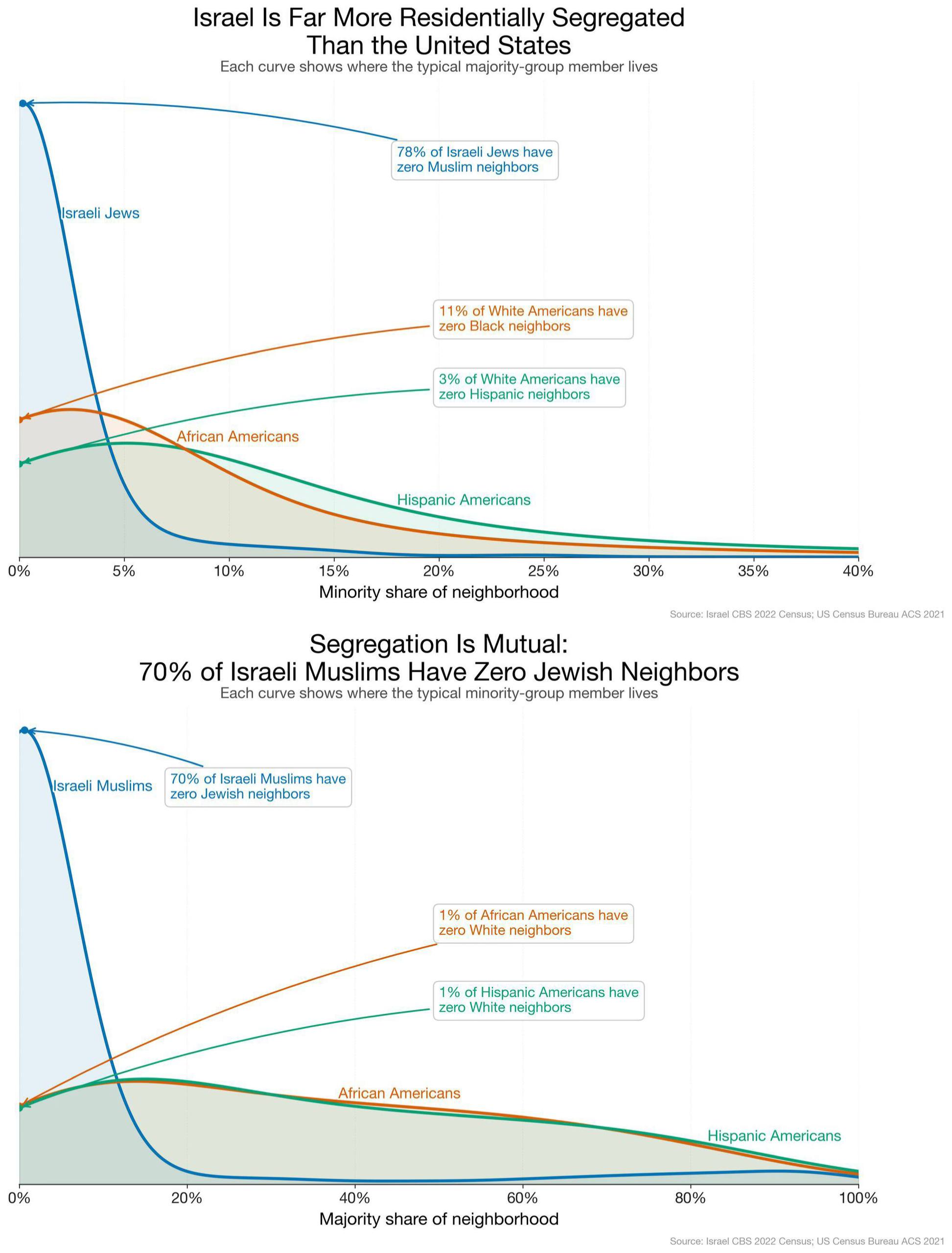 По данным переписи населения Израиля от 2022 г., 78% евреев не имели ни одного соседа-мусульманина. Для сравнения, по данным переписи-2021, среди белых американцев в США лишь 11% не имели соседей-афроамериканцев, лишь 3% не имели соседей-латиноамериканцев.