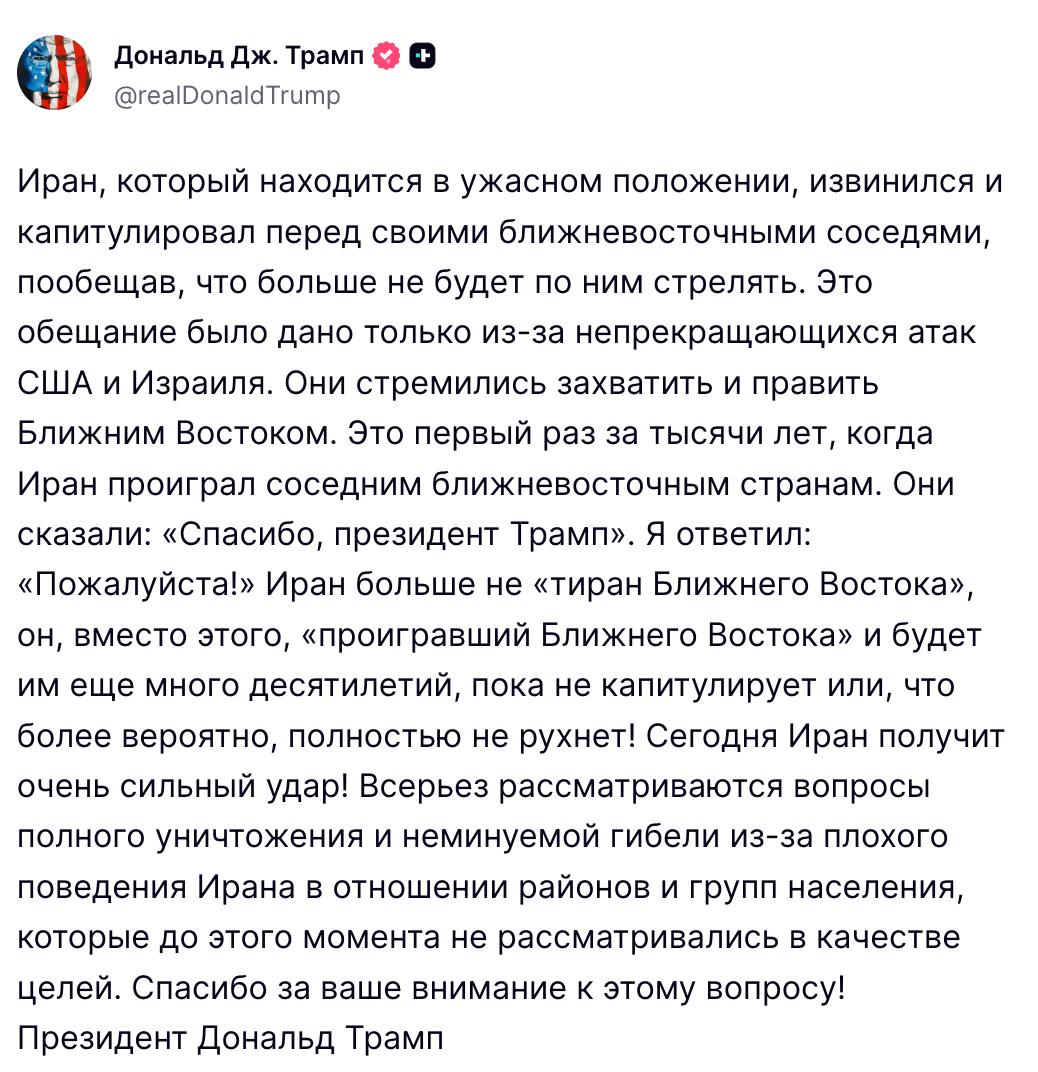 Трамп пригрозил, что США сегодня нанесут мощный удар по Ирану.