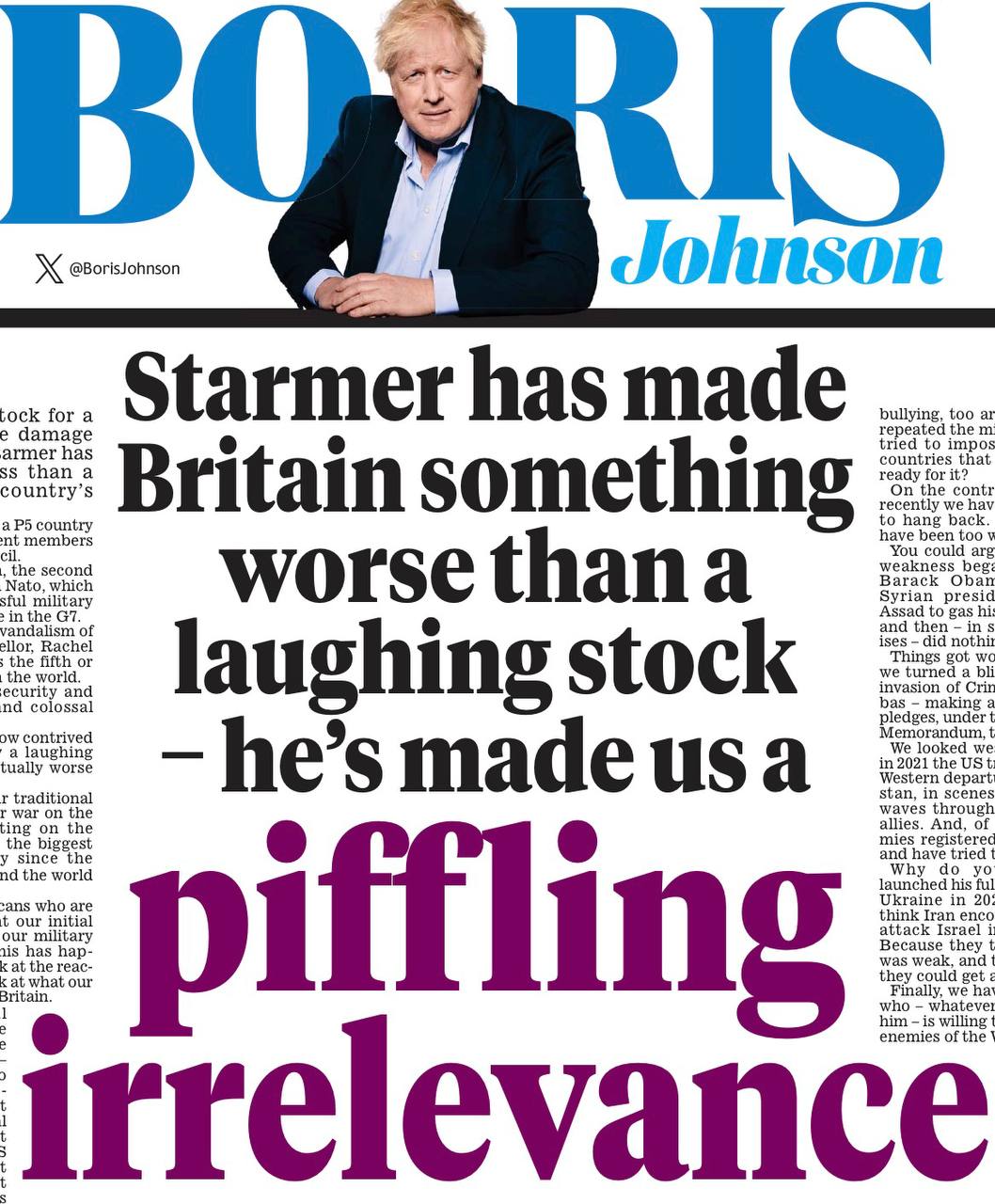 Бориска Джонсон на страницах Daily Mail жжет глаголом: «Стармер превратил Британию в что-то похуже посмешища - он сделал из нас ничтожную неуместность». Вот это формулировочка! Надо бы запомнить.