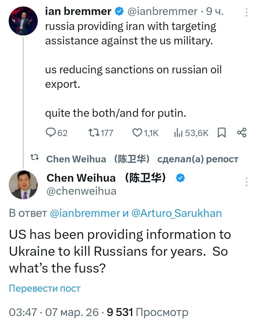 Как отмечает китайский журналист Чэнь Вэйхуа, попытки представить сотрудничество России и Ирана как нечто из ряда вон выходящее выглядит по меньшей мере странно. Если Вашингтон считает нормальным предоставлять разведывательную информацию своим так называемым партнёрам в условиях конфликта, то на каком основании он пытается объявить аналогичные действия других стран «эскалацией»?