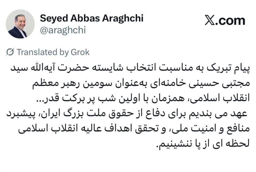 Министр иностранных дел Ирана Аббас Аракчи поздравил Аятоллу Сеййида Моджтабу Хаменеи с его избранием в качестве третьего лидера Исламской Республики, пообещав продолжать защищать национальные интересы Ирана, его безопасность и цели Исламской революции.
