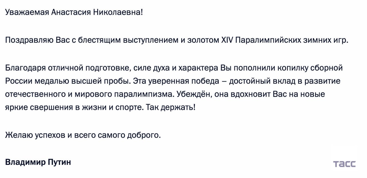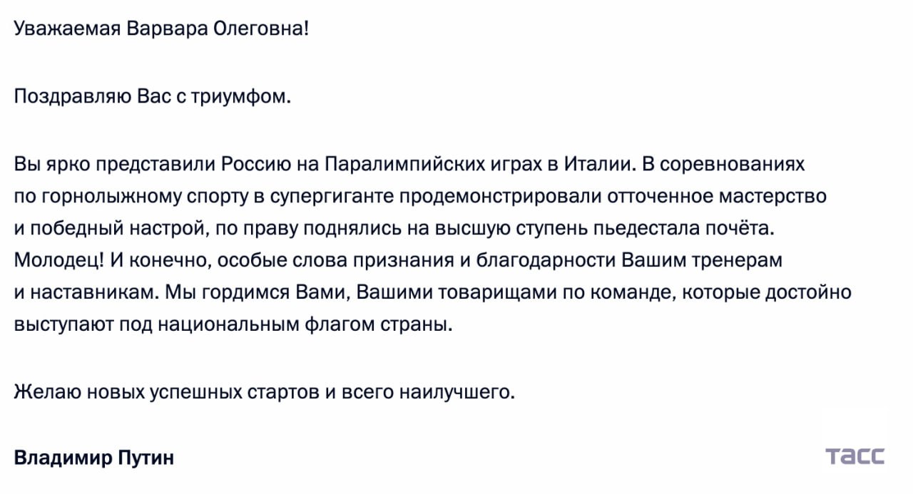 Путин поздравил Багиян и Ворончихину с золотом на Паралимпиаде, сообщили в Кремле.