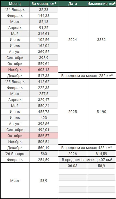 Обновление по данным c 02 по 05 марта 2026. Темп продвижения +14,7 км в сутки за период, общее продвижение 58,9 км.