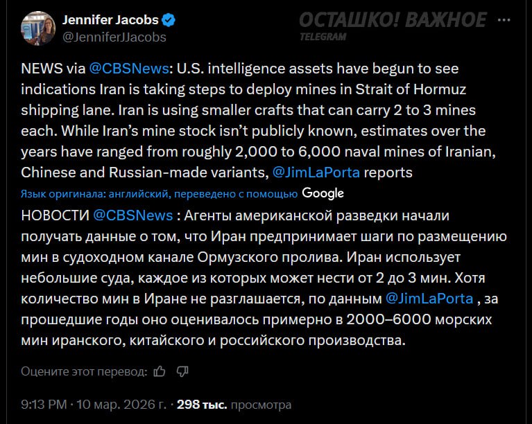 «Агенты американской разведки начали получать данные о том, что Иран предпринимает шаги по размещению мин в судоходном канале Ормузского пролива», — пишет журналистка CBS News Дженифер Якобс в Х.