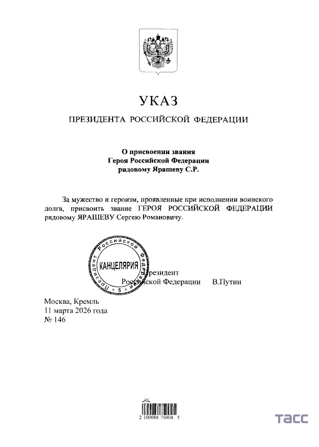 Сергею Ярашеву присвоено звание Героя России.Соответствующий указ подписал Владимир Путин.21-летний боец 68 дней удерживал позиции в районе Гришино.Подпишись в MAX@voenkorKotenok