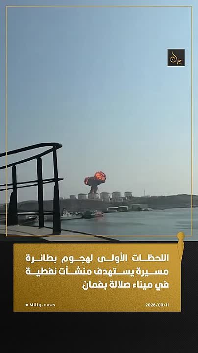 Видео опубликовали китайские моряки, снявшие удар. На кадрах — беспилотник, похожий на иранский «Шахед» бьёт точно в резервуар с топливом в порту Салала.